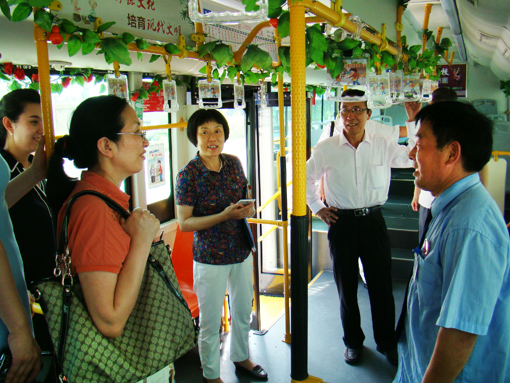 為有效提高老年人乘車安全系數(shù),公司為14路線在車廂內(nèi)設(shè)置“老幼病殘孕”愛心專座的基礎(chǔ)上,專門設(shè)置了“敬老專座”; 為了給老年乘客提供優(yōu)美的乘車環(huán)境,還在車廂的頂部和前部放置各種綠色植物和鮮花,同時,在駕駛座后面安裝了便民袋,配備常用藥物、老花鏡、針線包、意見簿及公交乘車指南、報紙、老年人專用雨披等物,讓老年乘客登上公交車,就能感受到清新氣息。