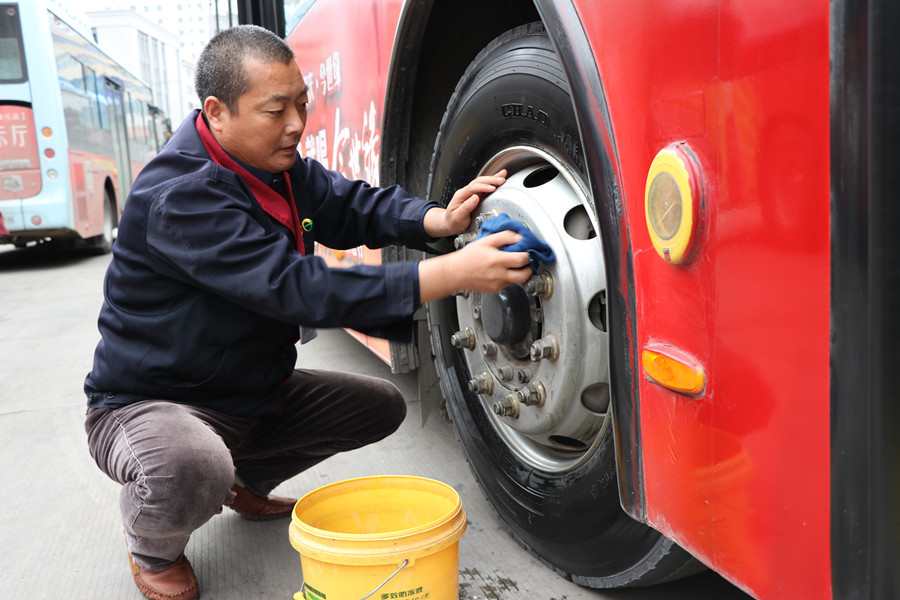 85路線經(jīng)過礦區(qū)路況差,一趟車下來車就很臟了,黨員祁保華把勞動(dòng)當(dāng)成一種樂趣,只要車輛停下來,他就會(huì)拿起刷子,把車身從前到后刷上一遍,再用抹布細(xì)細(xì)擦,輪胎更是一趟一擦,一天8個(gè)來回,他就要擦8遍輪胎。晚上在文化宮跑夜班,都晚上9點(diǎn)了,他還借著微弱的路燈,里里外外把車打掃干凈。在他的帶動(dòng)下,85路線駕駛員由觀望到比賽,都成了車輛保潔的好手。
